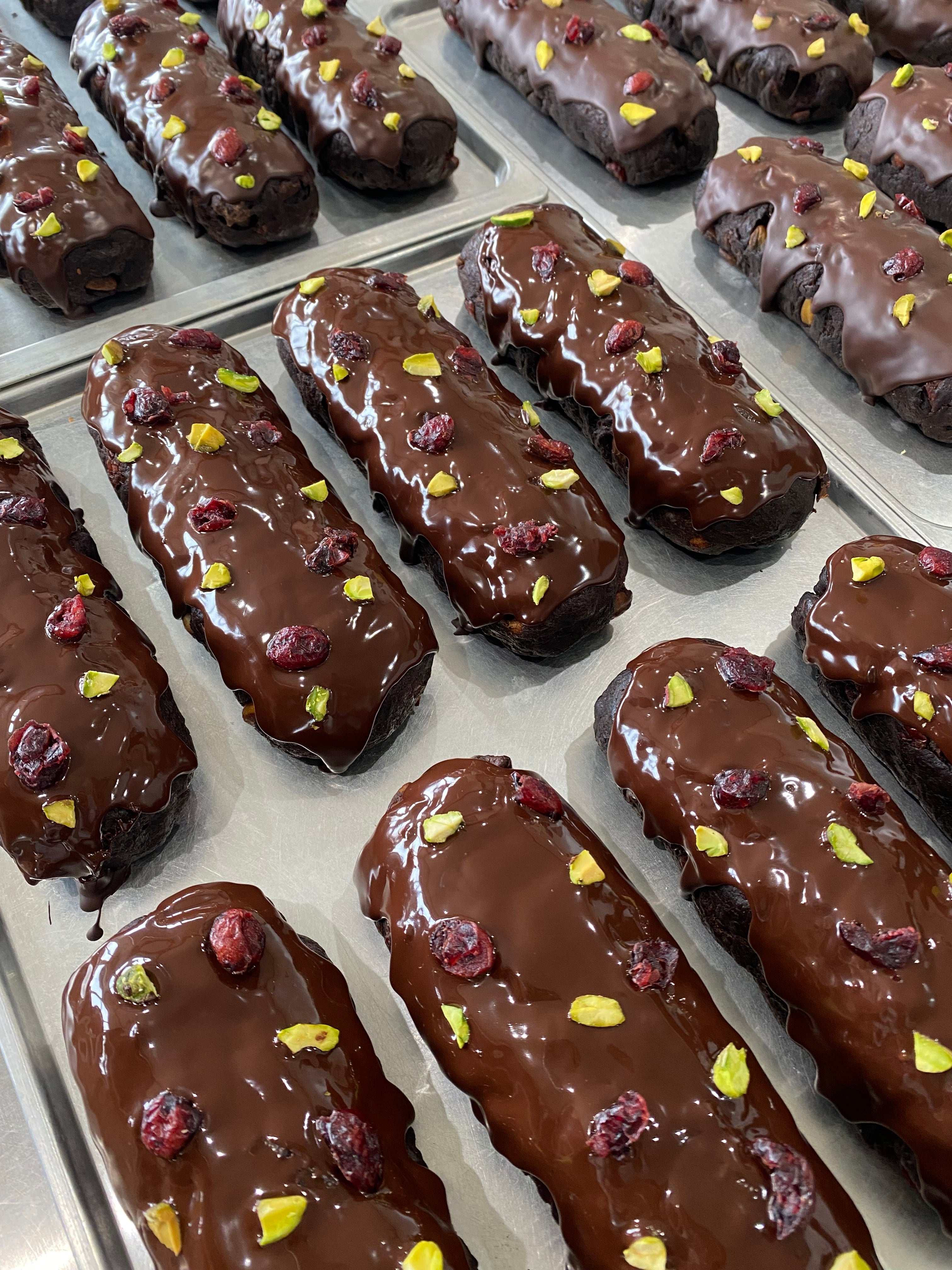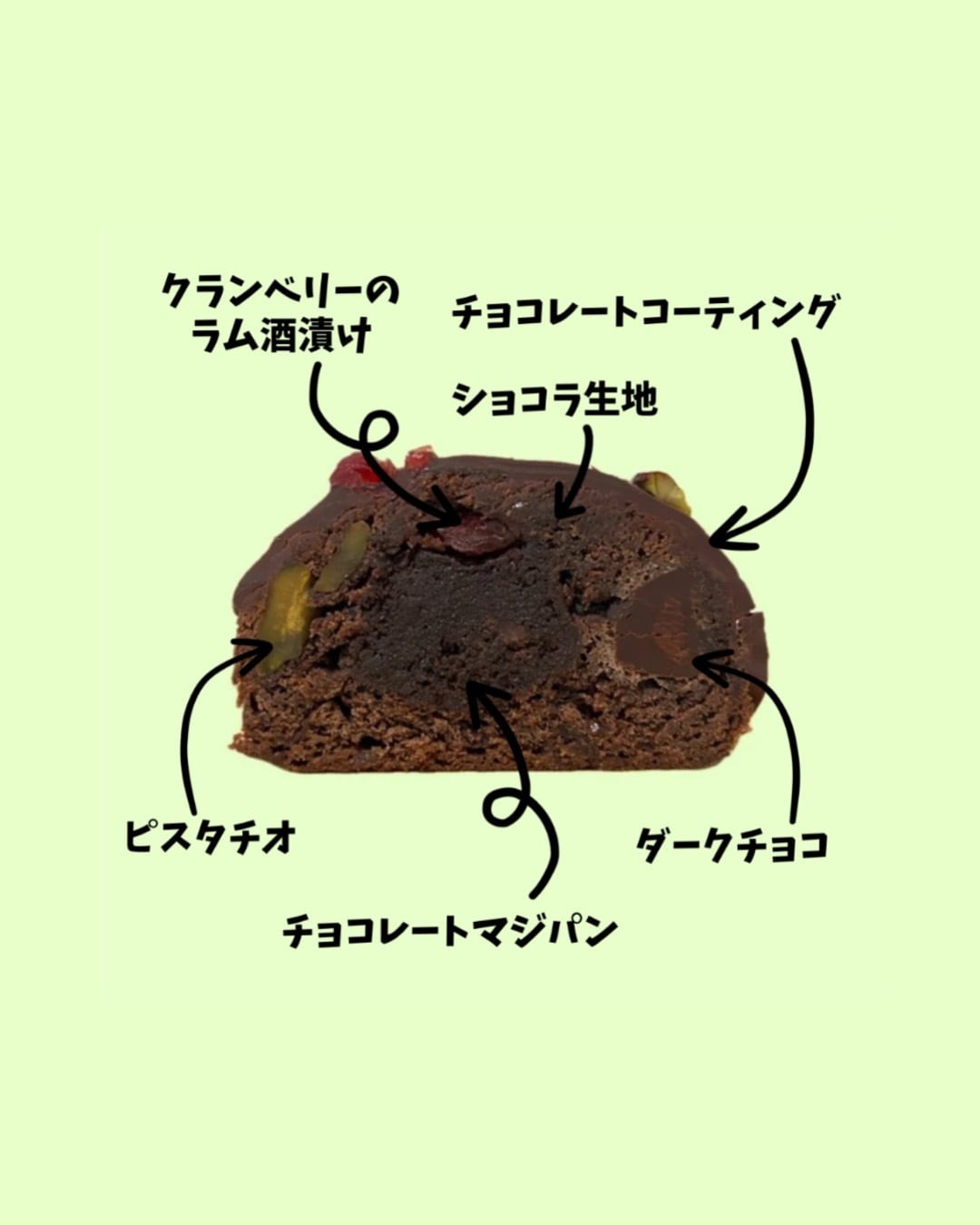 ラム酒漬けにしたクランベリーと香ばしいピスタチオ、そして四角いダークチョコレートをショコラ生地に混ぜ込んだ具だくさんなしシュトーレンです‼︎