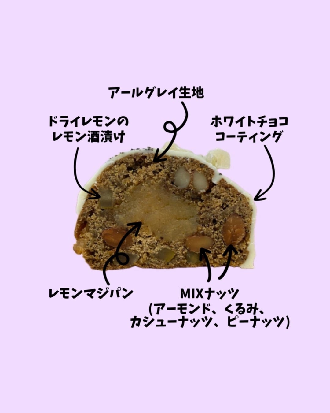 アールグレイ茶葉で香りを抽出した生地に、ドライレモンのレモン酒漬けと4種のナッツをたっぷり混ぜ込み焼き上げました。